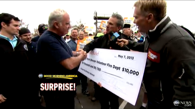 The $10,000 donation will help add a second story to the volunteer firehouse to provide safety in case floodwaters were to hit again, as they did during Superstorm Sandy.