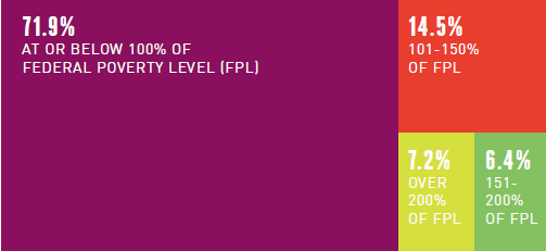 Of individuals for whom income level was known, the vast majority (71.9%) were living at 100% or below of the Federal Poverty Level (FPL) – in 2013, that amounted to $11,490 for an individual and $23,550 for a family of four.