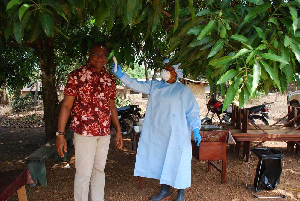 A midwife checks a visitor's temperature before he enters the Peripheral Health Unit in Makeni, Sierra Leone. The healthcare providers at this facility wear peronal protective equipment which was donated by Direct Relief, including surgical gown sets from Japan.