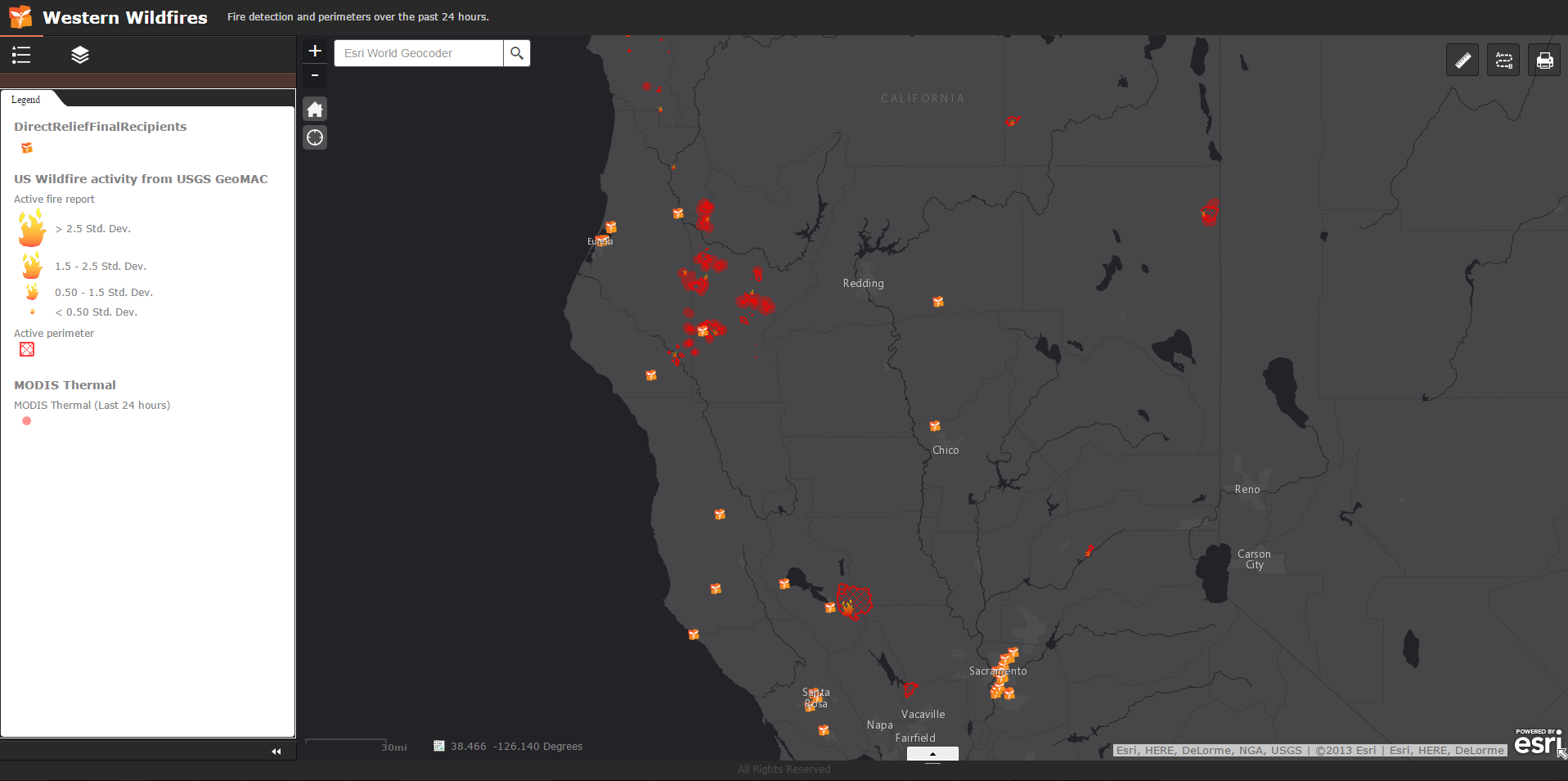 Direct Relief is responding to this situation by helping provide essential medical supplies including N-95 masks and asthma inhalers to safety net health centers who find themselves in the path of fire and smoke.  The map on this page tracks Direct Relief’s partner network with real-time detection of new blazes and changes in the intensity and perimeter area of ongoing fires.