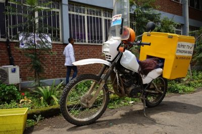 It’s a wet and chilly Monday morning outside the Addis Ababa Regional Laboratory (AARL). The thick metal gates open wide and a motorcycle with knobby tires and a tall yellow container attached to its rear roars up to the front reception area. In large block letters the container reads, “Ethiopia Mail.” Inside the yellow container is a battered blue cooler with peeling biohazard stickers affixed to both sides. Specimens in Ethiopia move through an agreement with the postal service.