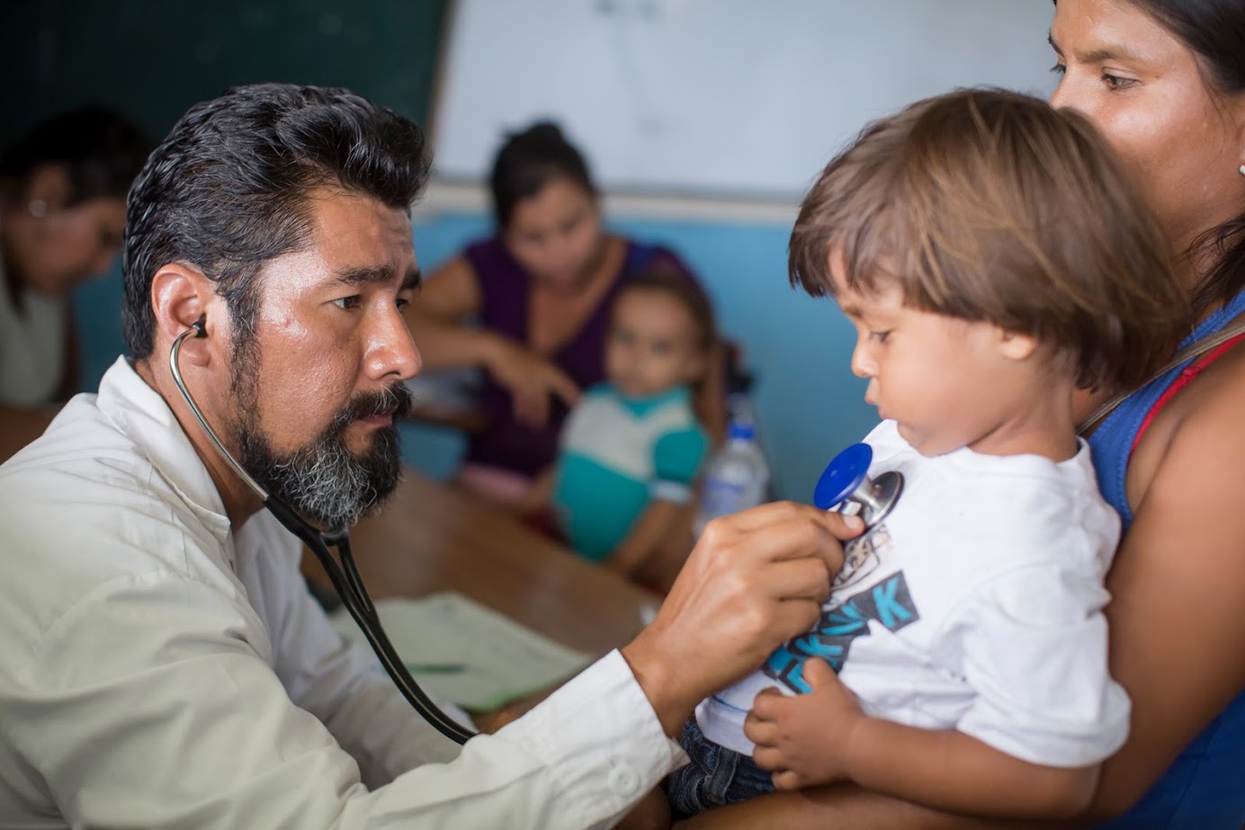A doctor cares for a young patient in Piura, Peru, as part of a medical volunteer campaign on April 9, 2017, an event supported by Vida Peru and Direct Relief. (Photo by Enrique Castro-Mendivil for Direct Relief)