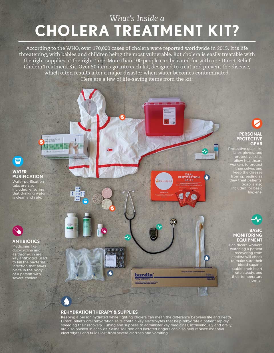 Over 50 items are included in Direct Relief’s cholera treatment kit, each part of which works to: