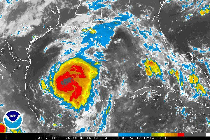 Hurricane Harvey, as seen over the Gulf of Mexico Thursday, is gathering strength as it barrels towards the Texas Coast. (NOAA)