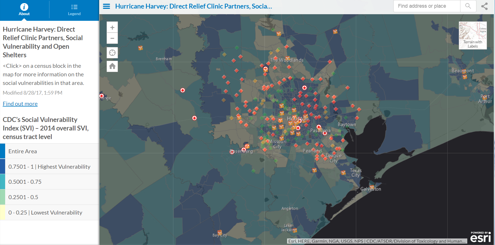 Click on the Hurricane Harvey map to view Direct Relief’s health care partners, flood levels, social vulnerability and open Red Cross shelters in the Houston area. (Map by Andrew Schroeder/Direct Relief)