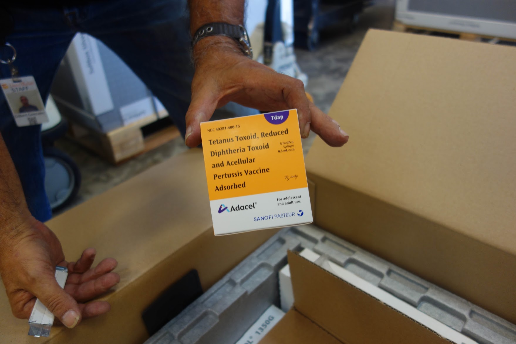 Tdap, a vaccine for tetanus, diphtheria, and pertussis, as well as vaccines for tetanus only, were packed and shipped in special temperature controlled containers from FedEx to maintain the quality and consistent temperature of the products.