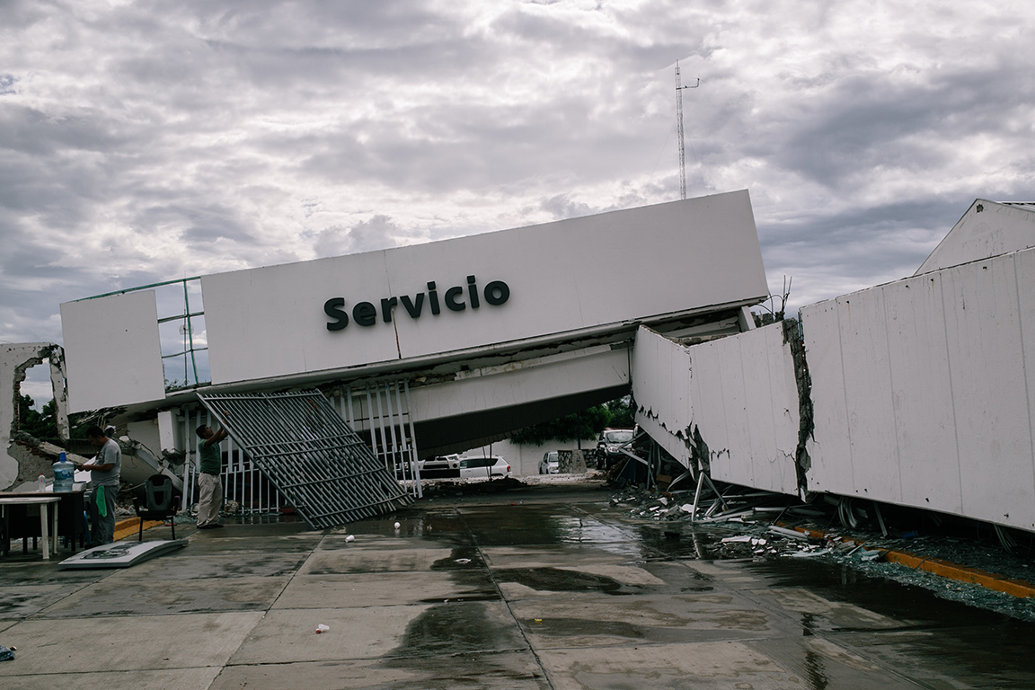 A Volkswagen service station sits collapsed on the side of the main road into Juchitan, Oaxaca. The damage occurred after an 8.1 magnitude earthquake ravaged the area, leaving over 70 dead in the state of Oaxaca, with more injured and thousands of homes destroyed.(Photo by Meghan Dhaliwal for Direct Relief)