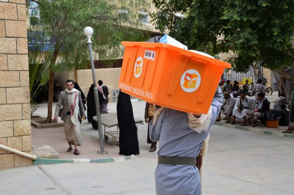 A Direct Relief Emergency Health Kit arrives in Yemen in August 2017. Direct Relief shipped two cholera treatment kits and an emergency health kit to hospitals in Hodeidah, Sana’a and Hajjah with the coordination of Save the Children Yemen. (Photo courtesy of Save the Children Yemen)