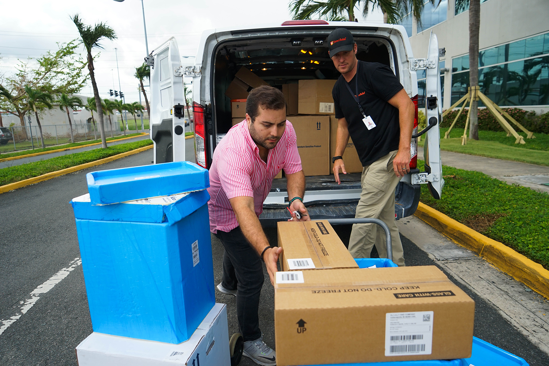 Direct Relief’s Andrew MacCalla and Ruben Bras of the Puerto Rico Primary Care Association transport insulin donated by Eli Lilly to a San Juan primary care clinic. (Lara Cooper/Direct Relief)