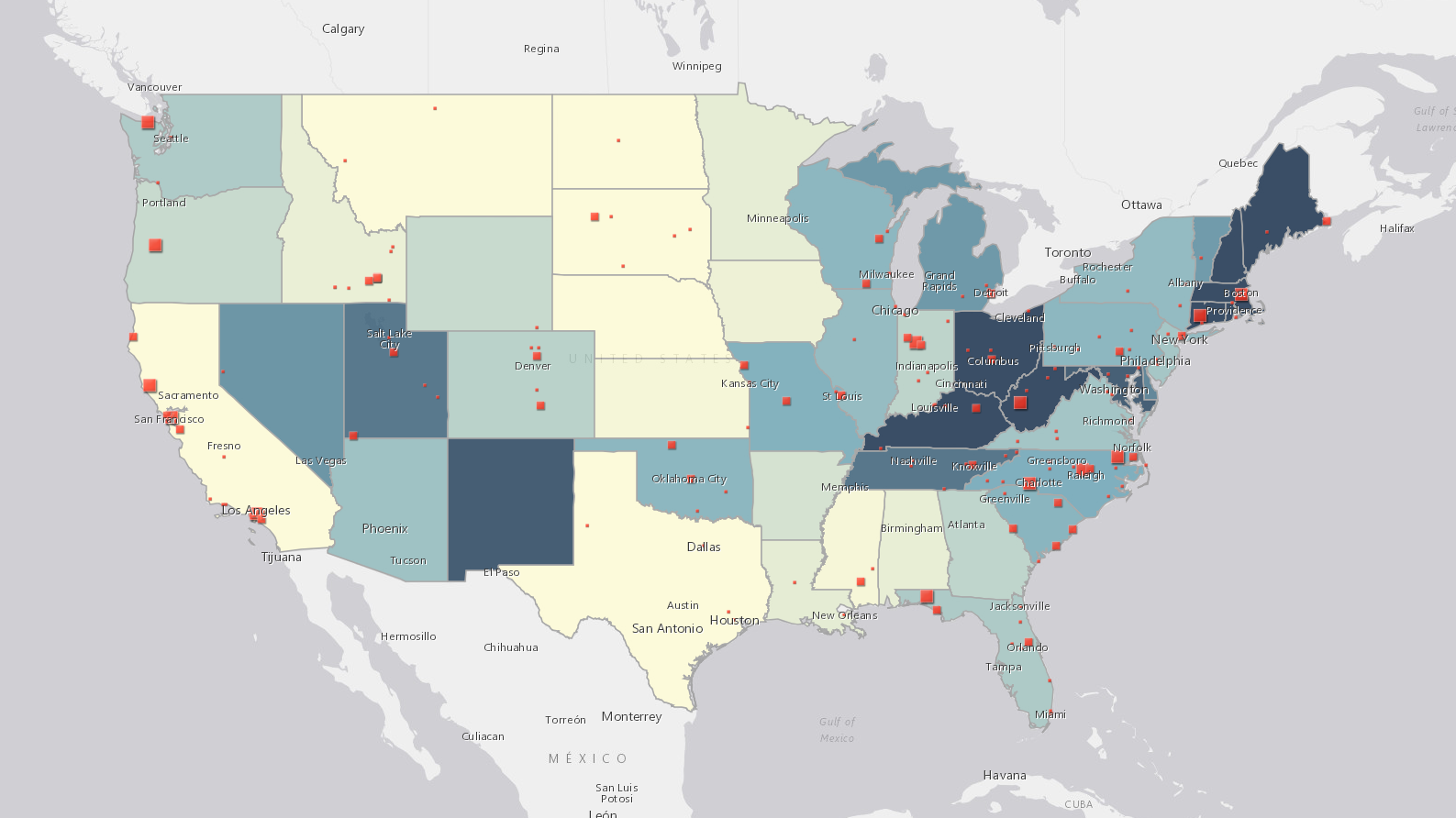 Click the map above to explore where Direct Relief deliveries of naloxone have gone across the United States. The red squares signify naloxone deliveries to health centers and the state colors indicate overdose mortality rates. (Map by Andrew Schroeder/Direct Relief)