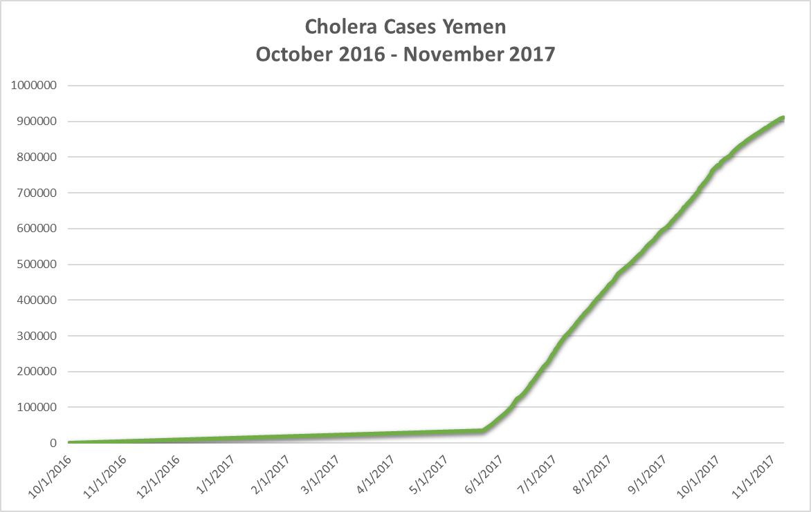 The cholera epidemic in Yemen, now one of history’s fastest spreading, began a little over a year ago, in October 2016. The country’s civil war was over a year-and-a-half old at that point. A report on Oct. 6 from health officials in the country’s capital city of Sana’a indicated that 11 of 25 acute diarrheal disease cases had just tested positive for the presence of cholera. This was sobering news given the severely damaged conditions of health and sanitation services throughout the country, and the significant challenges posed to the movement of goods and people across the war zones, but it was not evidence enough in itself to forecast what would happen over the next year.
