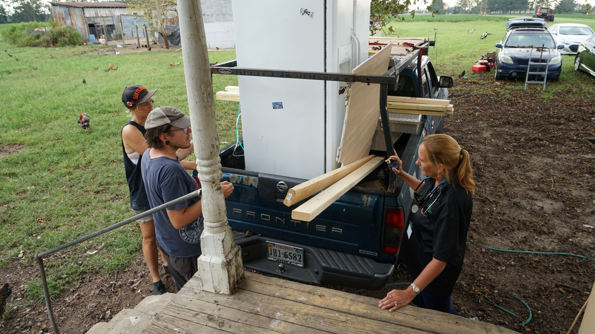 Nurse Gena Byrd (right), who does medical outreach for local farm workers for Greene County Health Care, coordinates with volunteers to move a new refrigerator into the home of an elderly patient outside Snow Hill, North Carolina. (Lara Cooper/Direct Relief)