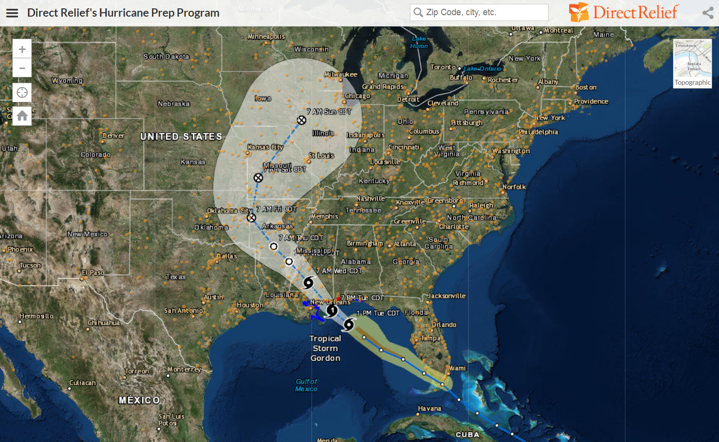 Click the map above to explore the storm's path and see where Direct Relief's Hurricane Preparedness Packs are located. (Direct Relief map)