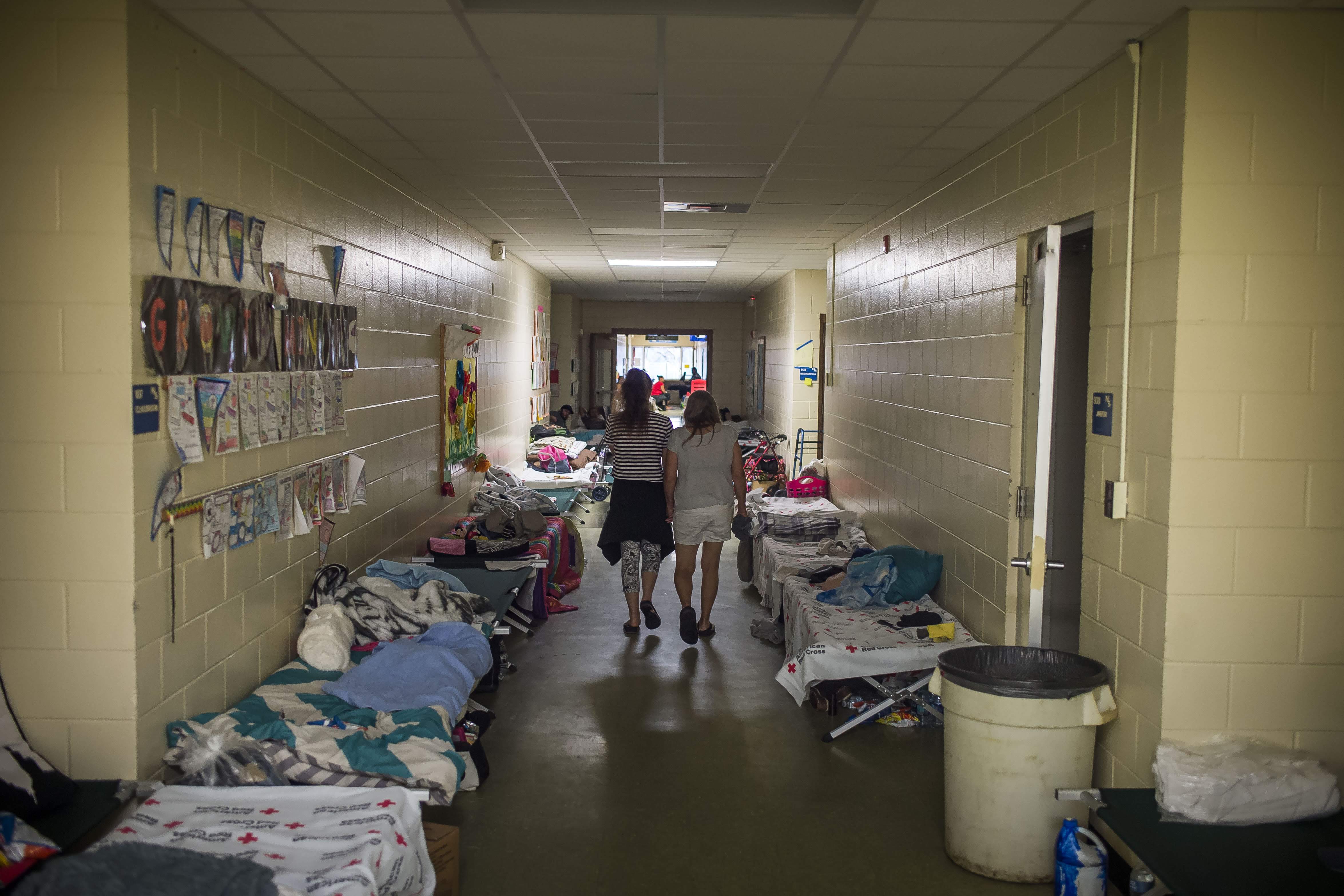 Evacuees walk the crowded halls of a hurricane shelter in Panama City on Saturday, October 13, 2018. Many medically vulnerable patients had been sent there after hospitals were impacted by Hurricane Michael. (Photo by Zack Wittman for Direct Relief)