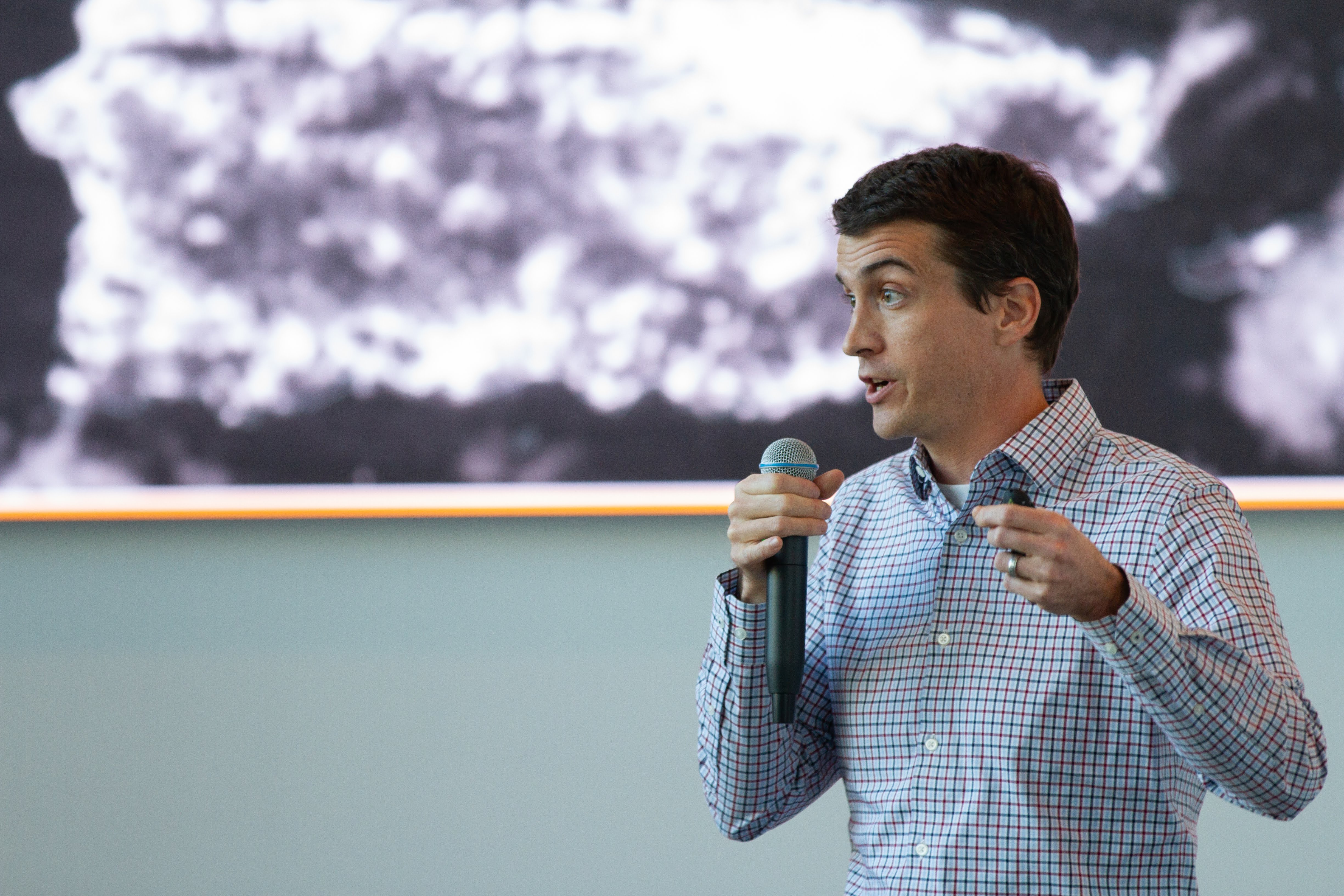 Dr. Mark Buntaine of UCSB's Bren School of Environmental Science and Management, speaks at Direct Relief on Dec. 12, 2018. Buntaine and Drs. Kelsey Jack, Ashley Larsen and Kyle Meng spoke about the effect of climate and disaster response. (Lara Cooper/Direct Relief)