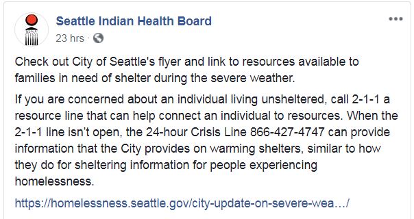 Seattle Indian Health Board is doing its best to inform patients in the hopes of returning to normal operating hours early this week. A recent update posted by staff on Facebook offered information about warming shelters for those experiencing homelessness.