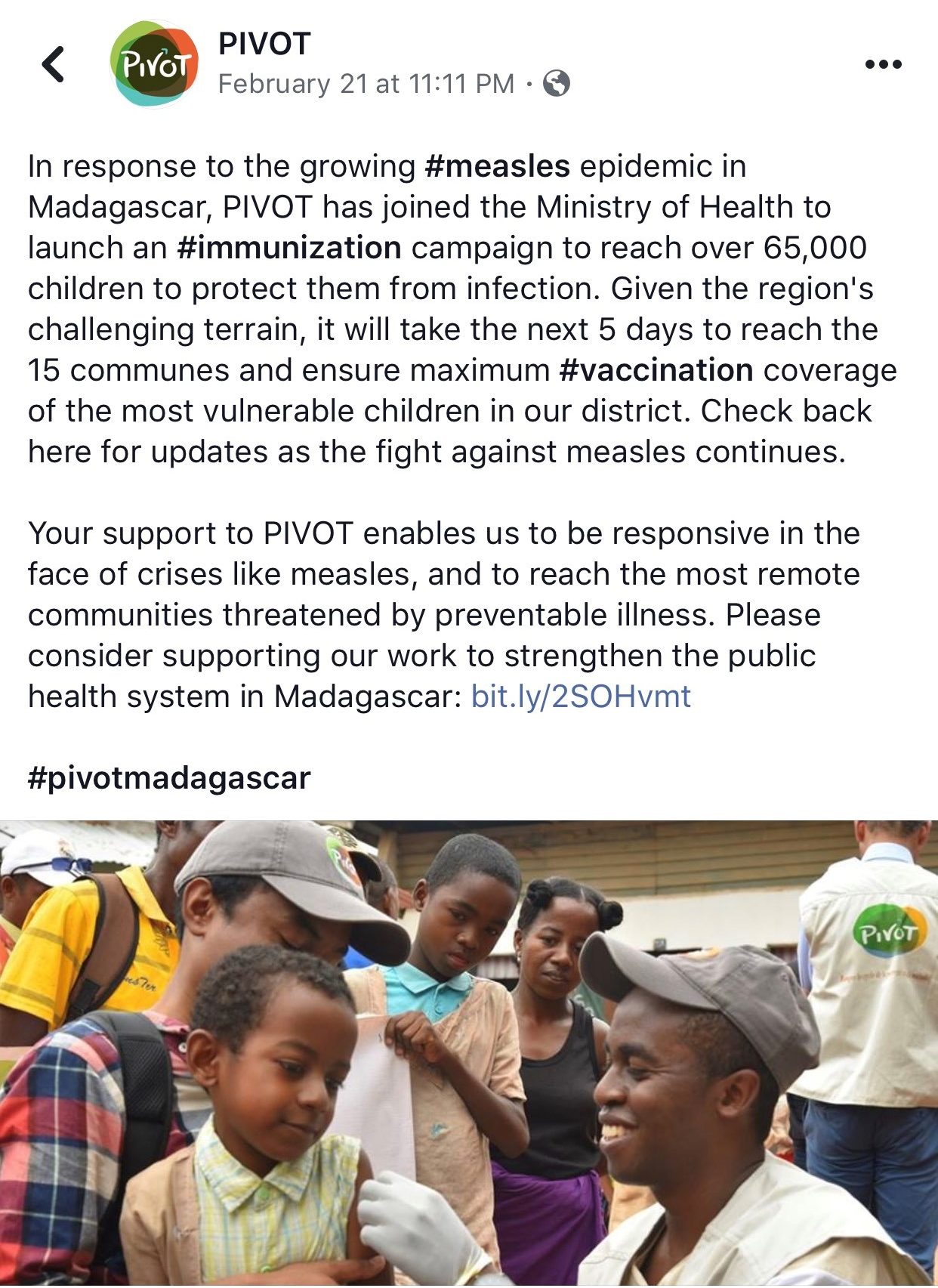 This is an alarming situation,” said Dr. Ali Ouenzar, National Director of PIVOT, a prominent health sector NGO and Direct Relief partner on the front lines of the epidemic. Preventive measures must be accelerated to prevent the spread of the disease, he said. The group just completed a vaccination campaign effort that reached 65,000 children, ages 6 months to 9 years, in the district of Ifanadiana.