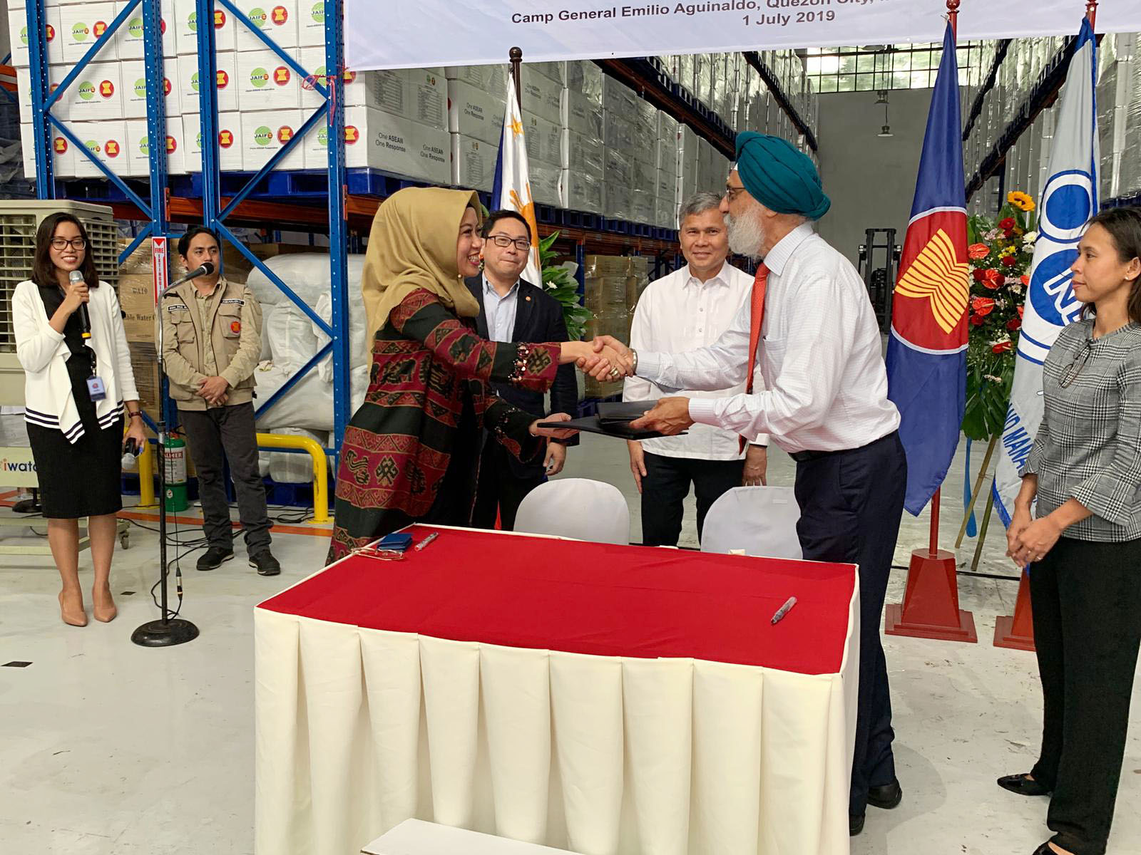 AHA Centre Executive Director Adelina Kamal (center left) and Direct Relief's Executive Vice President and Chief Operating Officer Bhupi Singh formally inaugurate a newly completed warehouse in the Philippines on July 1, 2019. The warehouse, completed with funding from Direct Relief, will expand disaster response in the region. (Direct Relief photo)