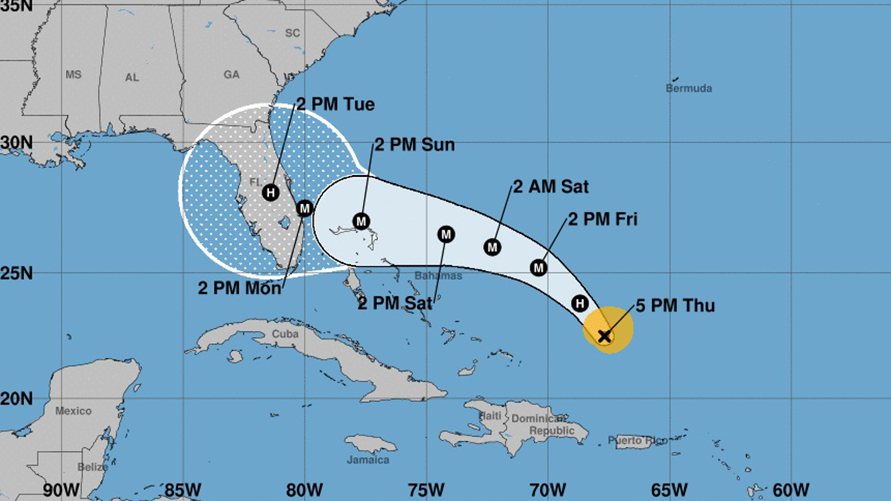 A map showing Dorian’s cone of uncertainty, released by the National Hurricane Center on the afternoon of Thursday, August 29. (Map courtesy of the National Hurricane Center)