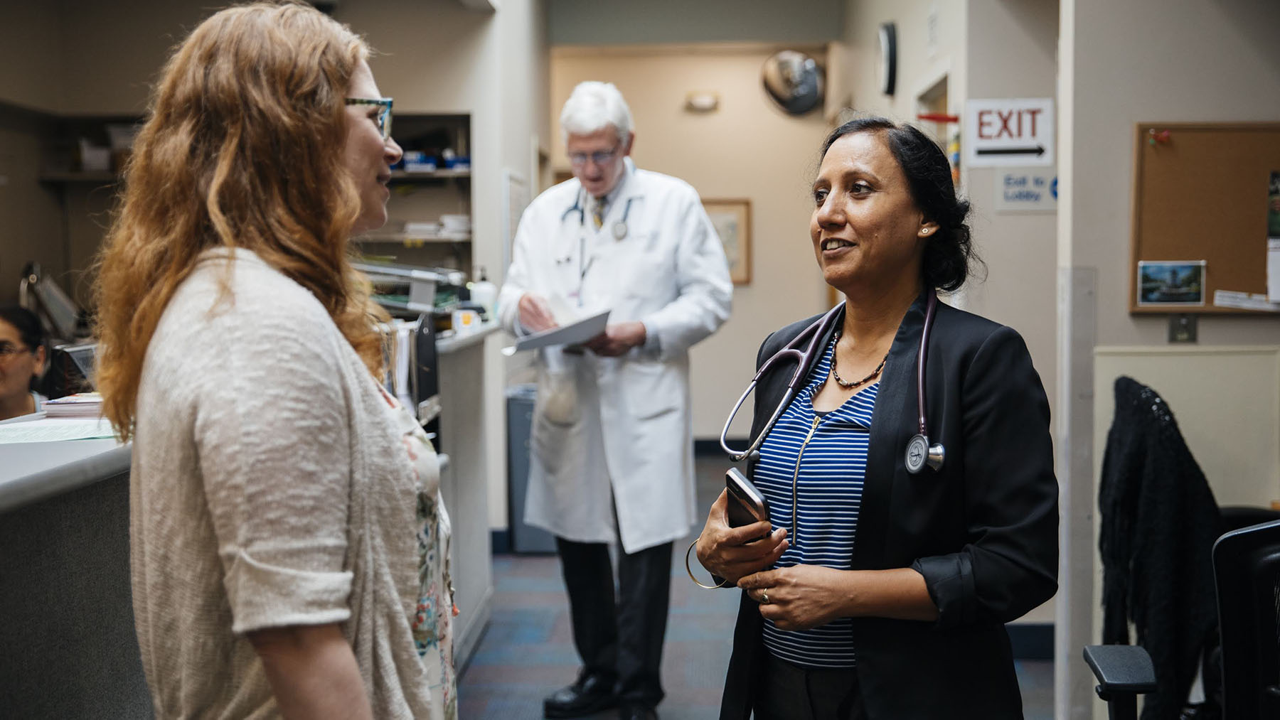 Dr. Roli Dwivedi (right), clinical director, Community University Health Care Center in Minneapolis, speaks with the center’s director of pharmacy, Christina Cipolle. The health center works with care teams to treat the whole patient as they work to manage chronic diseases like diabetes. (Photo by Donnie Hedden for Direct Relief)