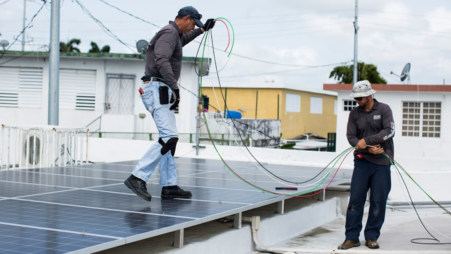 From left, brothers Luis Montalvo and Jared Montalvo install a solar power system at Clínica Iella in San Juan, Puerto Rico, on July 5, 2018. Solar power can keep a clinic operational during a disaster and protect vital medicines. The need for alternative power sources became evident after Maria wiped out power for months.(Erika P. Rodriguez/Direct Relief)