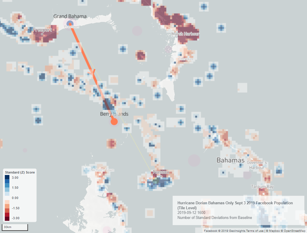 9/6- Analyzing population movement using available cell phones connected to a network in The Bahamas, Schroeder reported that, “The only movement seen is between Freeport and Nassau– which is consistent with the evacuations.