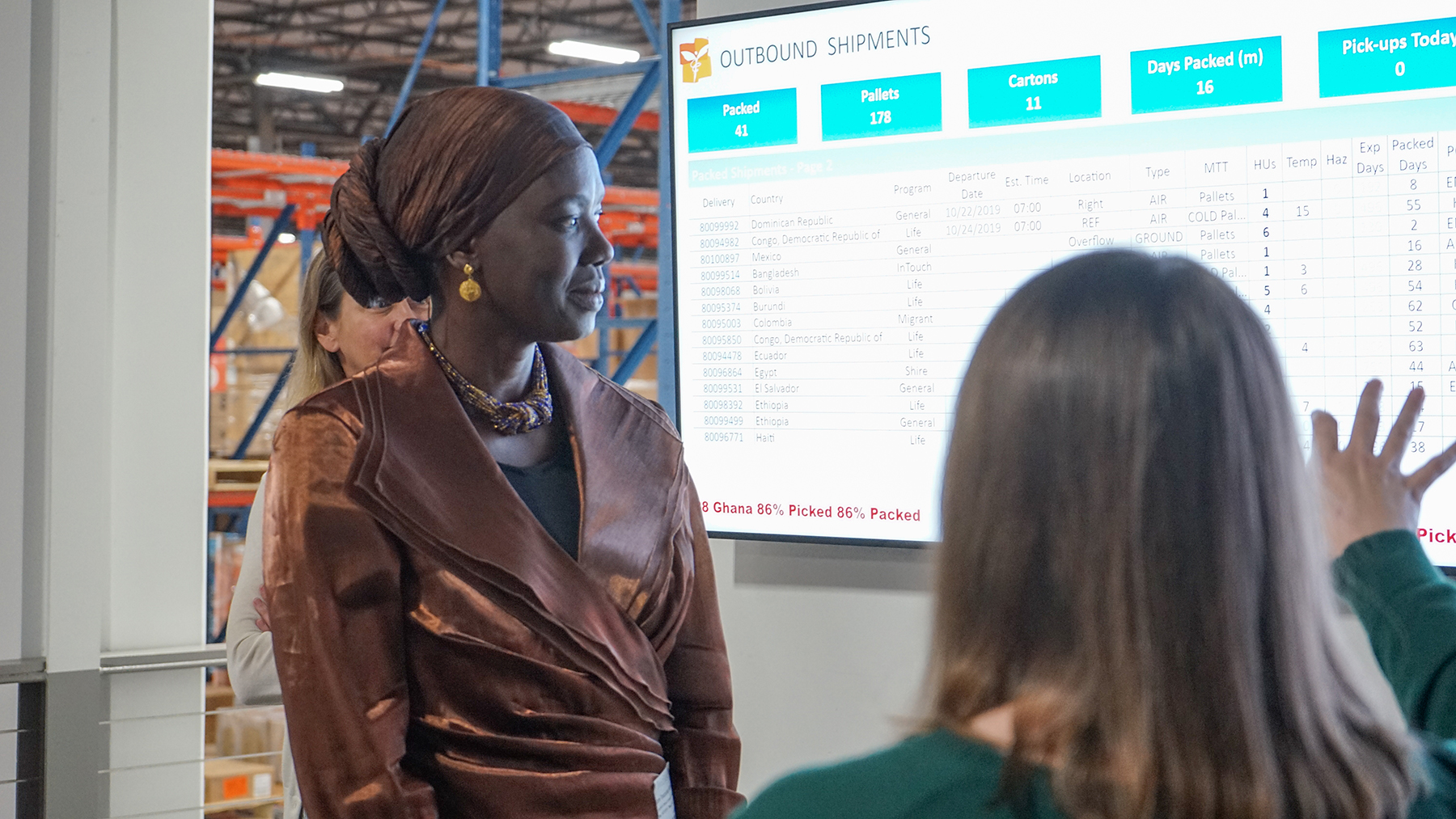 Honorary Consul General to Senegal Mame Toucouleur Mbaye looks over outbound medical shipments leaving Direct Relief's warehouse on Monday during a tour of the organization's headquarters. (Lara Cooper/Direct Relief)