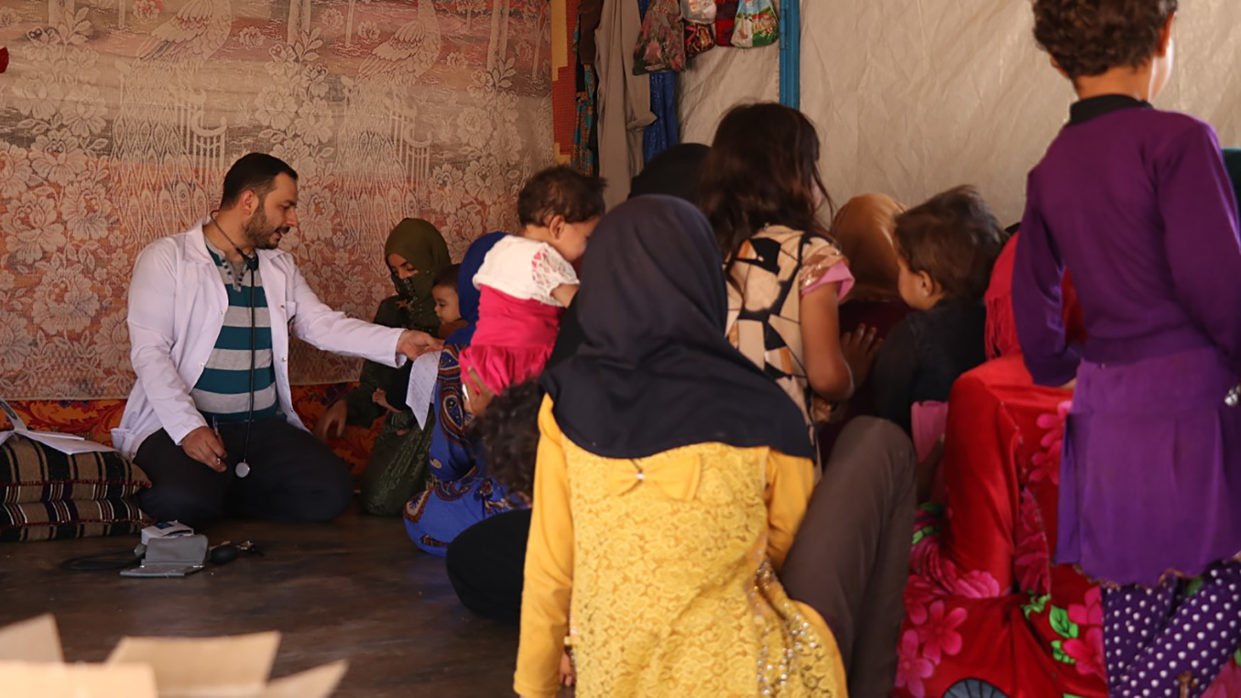 A Syrian American Medical Society health worker provides care to women and children outside of hospital walls in Syria. Many medical facilities have been targeted by missiles, and care must often take place elsewhere for safety reasons. (Photo courtesy of SAMS)