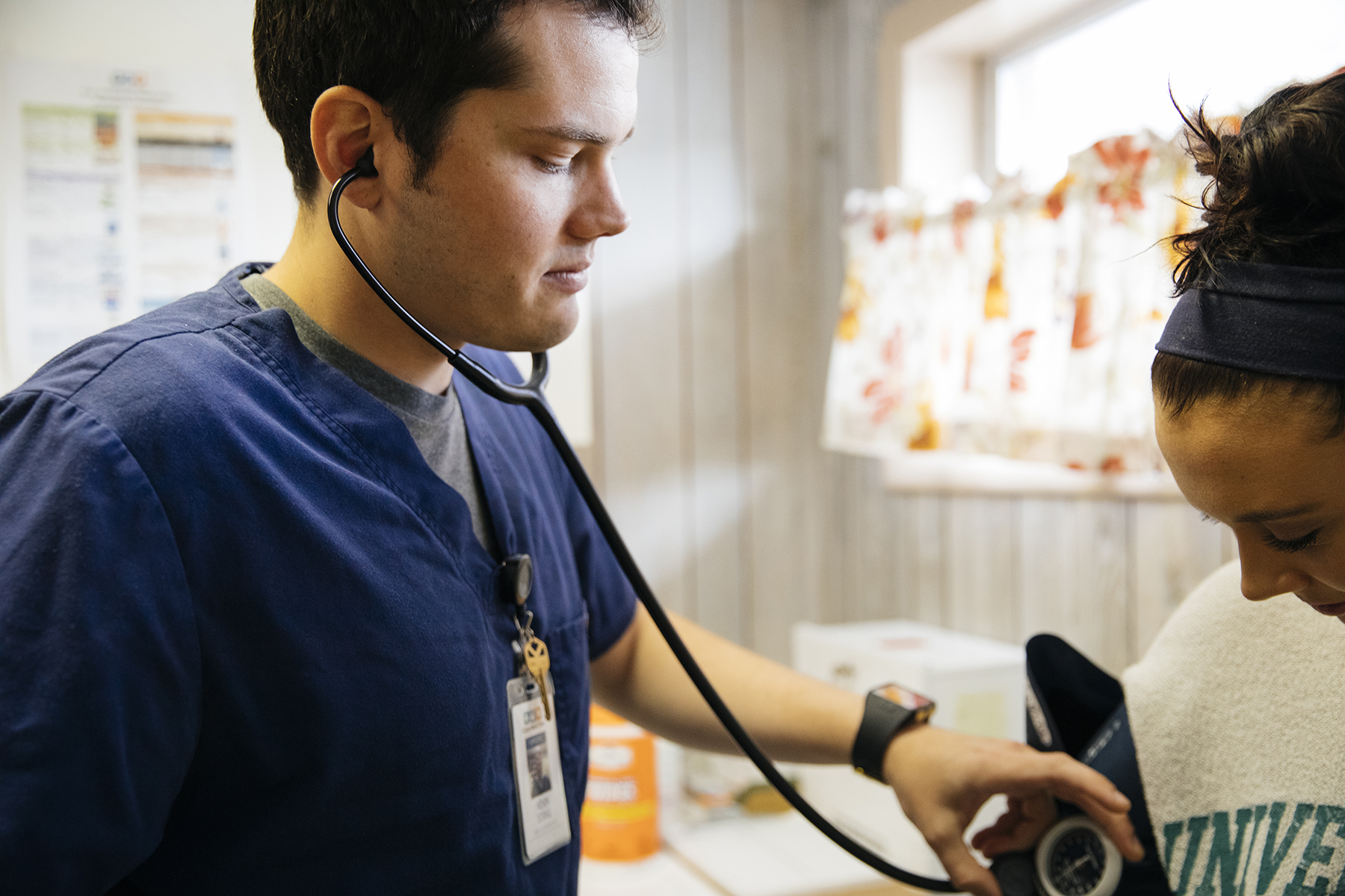 Volunteers at free clinic Medspire, take a patient’s vitals during a clinic day in Magalia, California. The free clinic was started to address unmet needs of vulnerable residents after the Camp Fire destroyed most of neighboring Paradise. (Photo by Mark Semegen for Direct Relief)