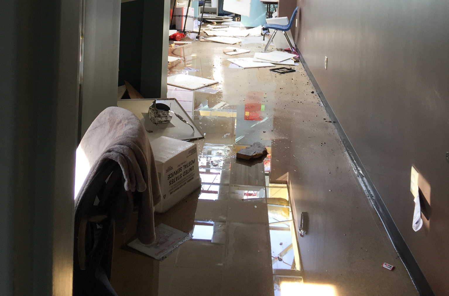 The tornado ripped the roof off the building and flooded the inside.