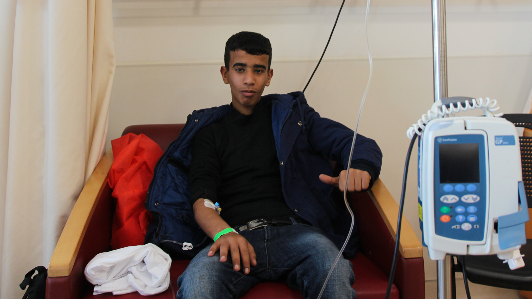 Seventeen-year-old Mahmud prepares for his infusion therapy to manage Gaucher disease at a hospital in Jerusalem. Mahmud and his family travel from Gaza into Jerusalem for his treatments. (Anushka Hauerstock for Direct Relief)
