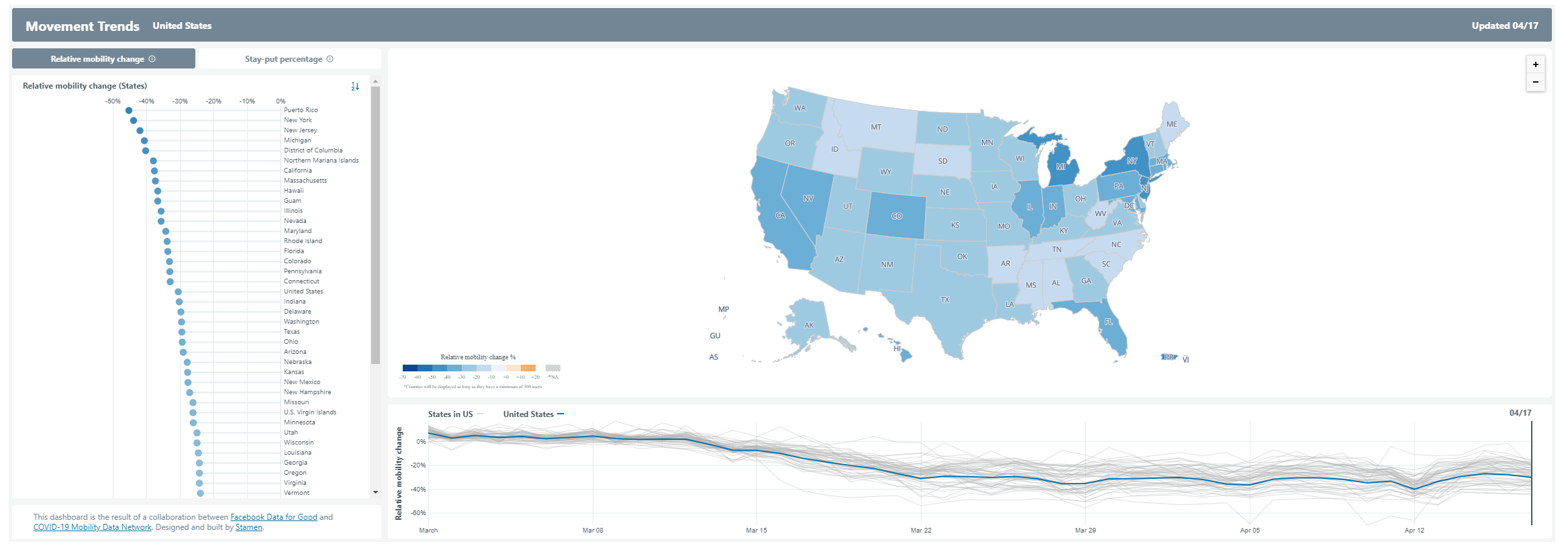 For the past several weeks, Direct Relief has helped to bring insights and information concerning aggregated rates of population mobility to the attention daily of health officials and policymakers throughout the U.S. and other parts of the world. In California, Direct Relief is participating daily as part of the data team informing the governor’s Covid-19 response policies. At the same time, Direct Relief has helped to create and co-coordinate, along with colleagues at the Harvard T.H. Chan School of Public Health, the Covid-19 Mobility Data Network, which links together dozens of infectious disease experts and data scientists in a voluntary effort to provide operational analytical support to key public decision-makers throughout the Covid-19 response.