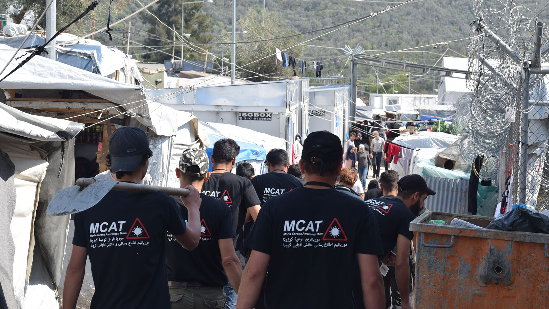 Members of the Moria Coronavirus Awareness Team conduct outreach in the camp. (Photo by Muhannad Al Mandil)