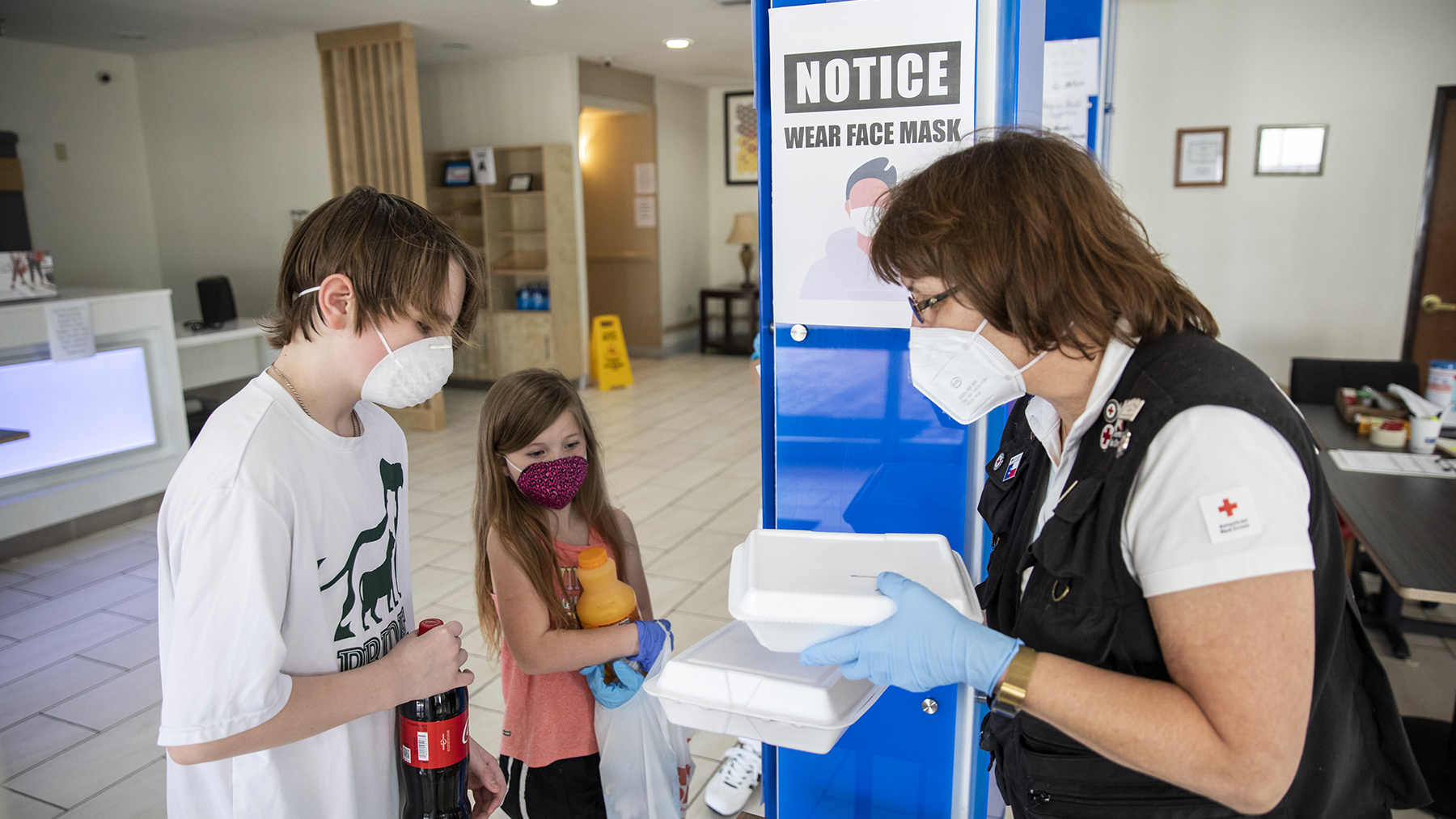 An American Red Cross staff member distributes meals at a hotel where the organization provided emergency lodging just a few miles from Onalaska, TX. The community was hit by a powerful tornado that damaged hundreds of homes on April 22, 2020. (Photo by Scott Dalton for the American Red Cross)