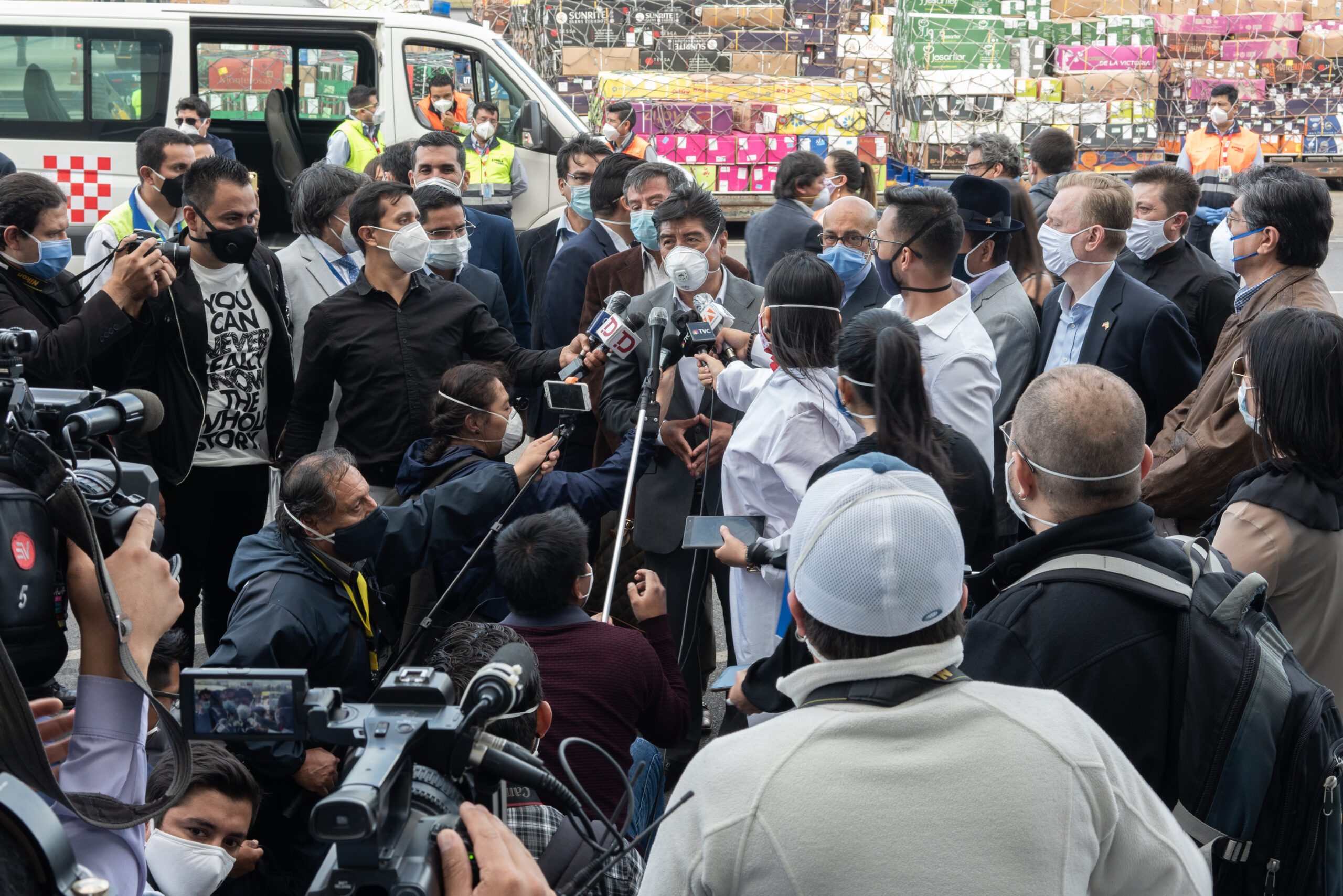 Quito Mayor Dr. Jorge Yunda at Mariscal Sucre International Airport in Quito during a press conference for health equipment donations from Direct Relief that arrived in the country on June 4, 2020. (Isadora Romero for Direct Relief)