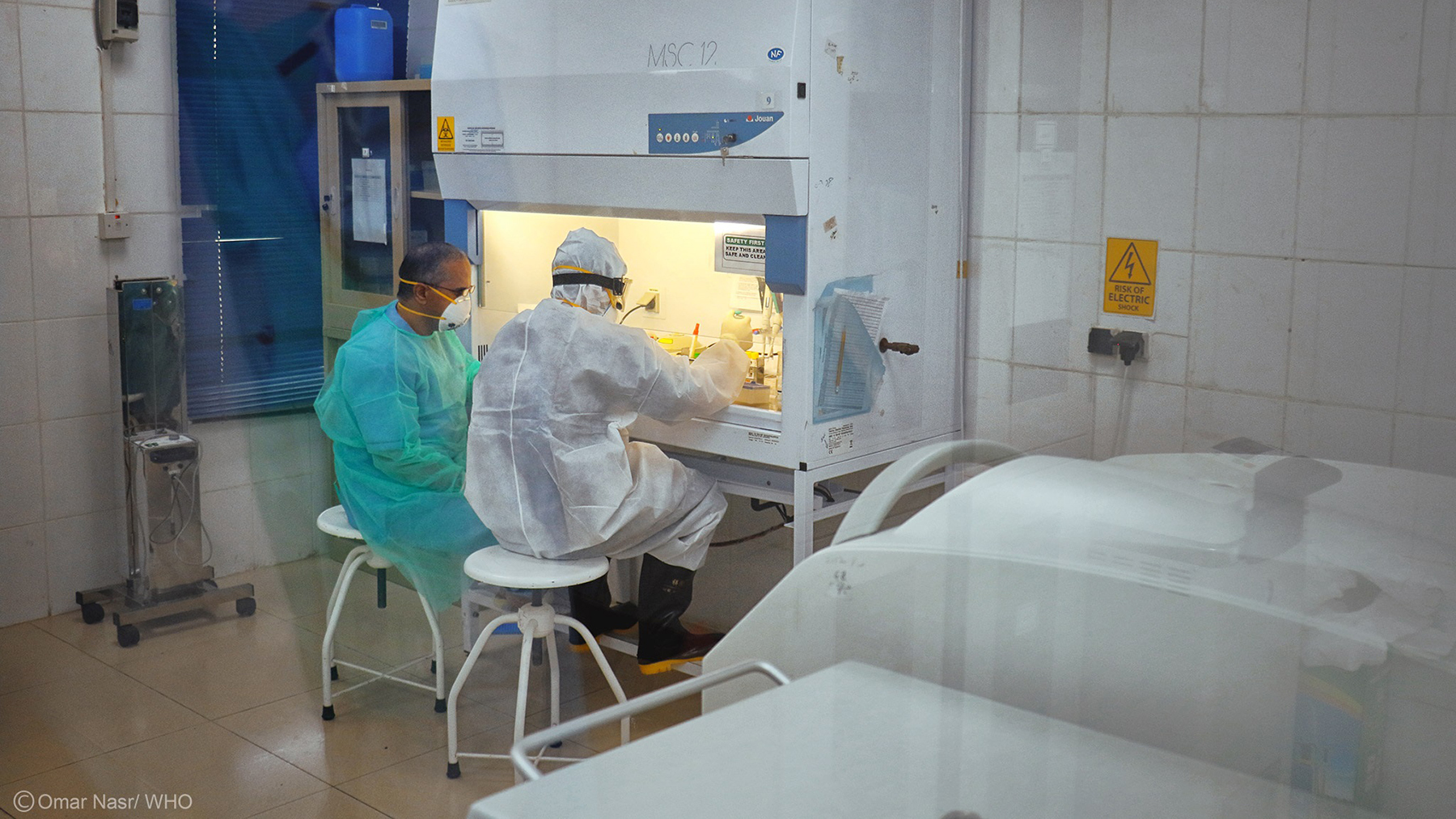 Health care workers conduct a laboratory test. (Photo courtesy of the World Health Organization)