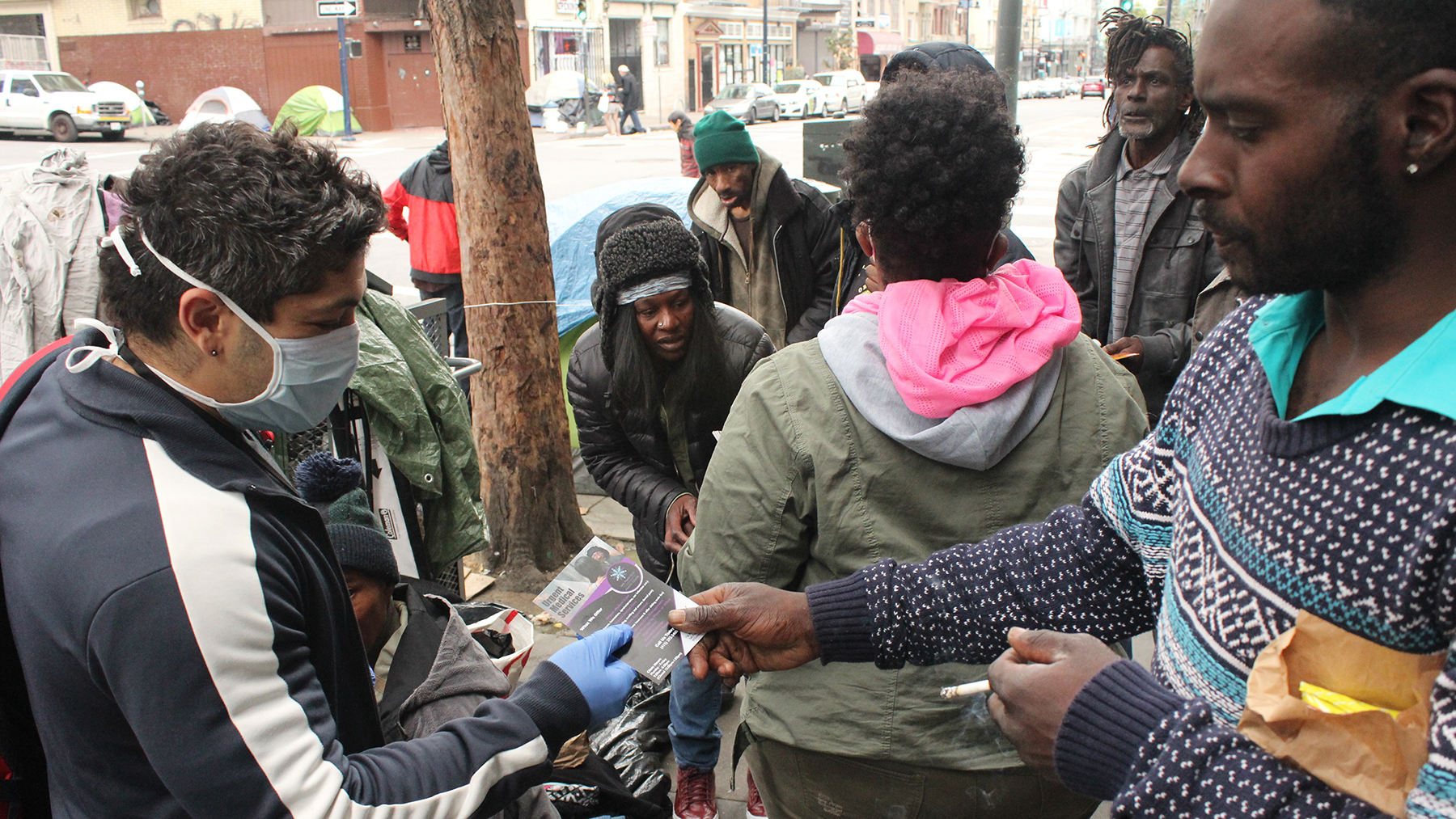 A SFCHC staff member distributes pamphlets to people in San Francisco’s Tenderloin district. (Photo courtesy of SFCHC)