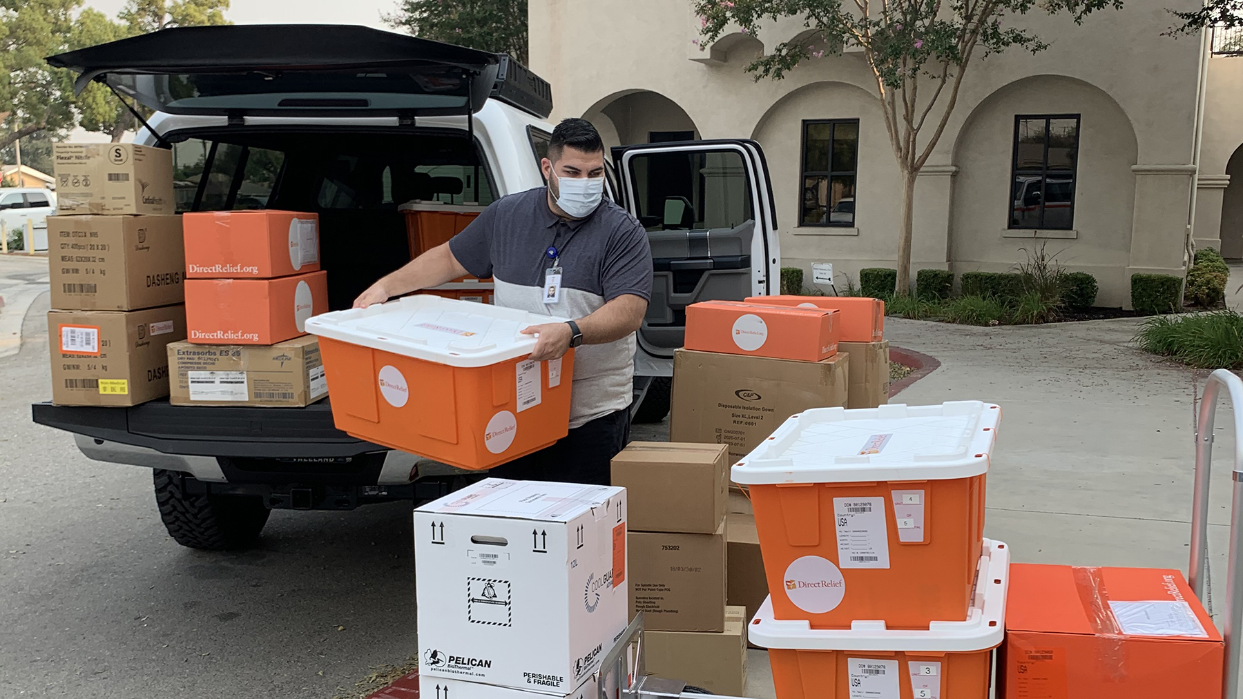 Requested medical supplies arrived at the Chino Valley Community Health Center in San Bernardino County, California, on Sept. 11, 2020. The El Dorado Fire is impacting air quality in the region, and supplies delivered to the health center included respiratory medicines, opthalmic supplies and other essentials often requested during fires. (Chris Alleway/Direct Relief)