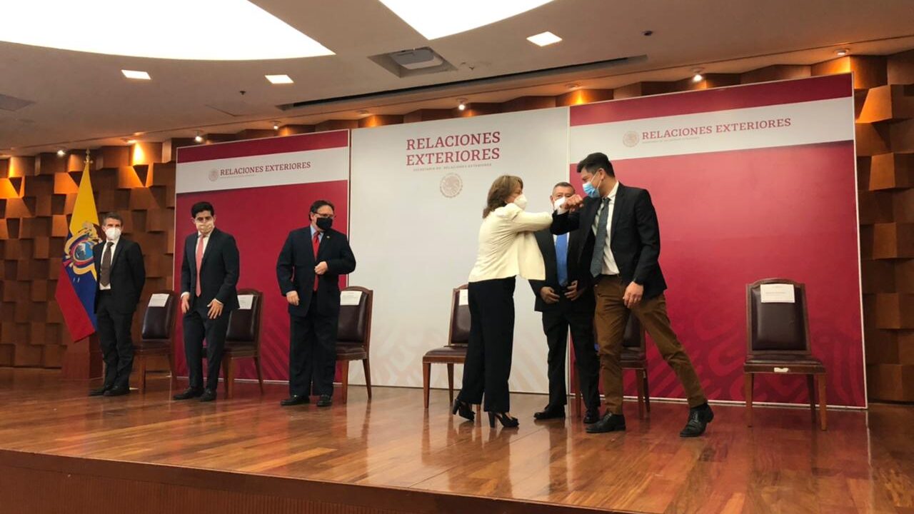 Officials from Direct Relief and the governments of Mexico and Ecuador discuss the humanitarian shipment of polio vaccine to Ecuador at an event on March 16, 2021. From left to right: Rodolfo Osorio de Carrera, General Director for Liaisons with Civil Society Organizations at the Ministry of Foreign Affairs of Mexico; Martín Alonso Borrego Llorente, General Director for Latin America and the Caribbean at the Ministry of Foreign Affairs of Mexico; Enrique Ponce de León, Ambassador of Ecuador to Mexico; Martha Delgado, Undersecretary of Multilateral Affairs and Human Rights at the Ministry of Foreign Affairs of Mexico; Pedro Mario Zenteno Santaella, General Director of BIRMEX; Eduardo Mendoza, Country Director, Direct Relief Mexico. (Photo: Edmundo Montes de Oca, Ministry of Foreign Affairs of Mexico.)