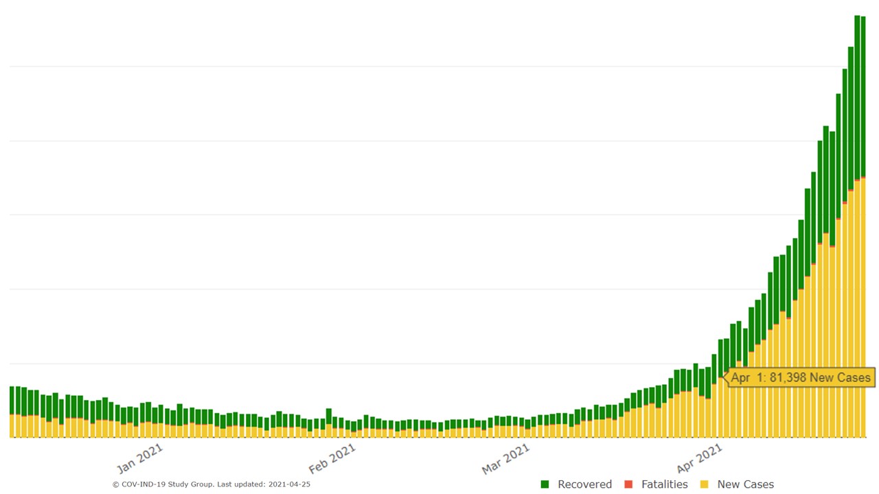 The virus is spreading in every state, with the most significant increases occurring in the heavily urbanized areas of Maharashtra, Uttar Pradesh, Delhi, Karnataka, and Kerala. The influx of seriously ill patients is overwhelming hospitals throughout large areas of the country.