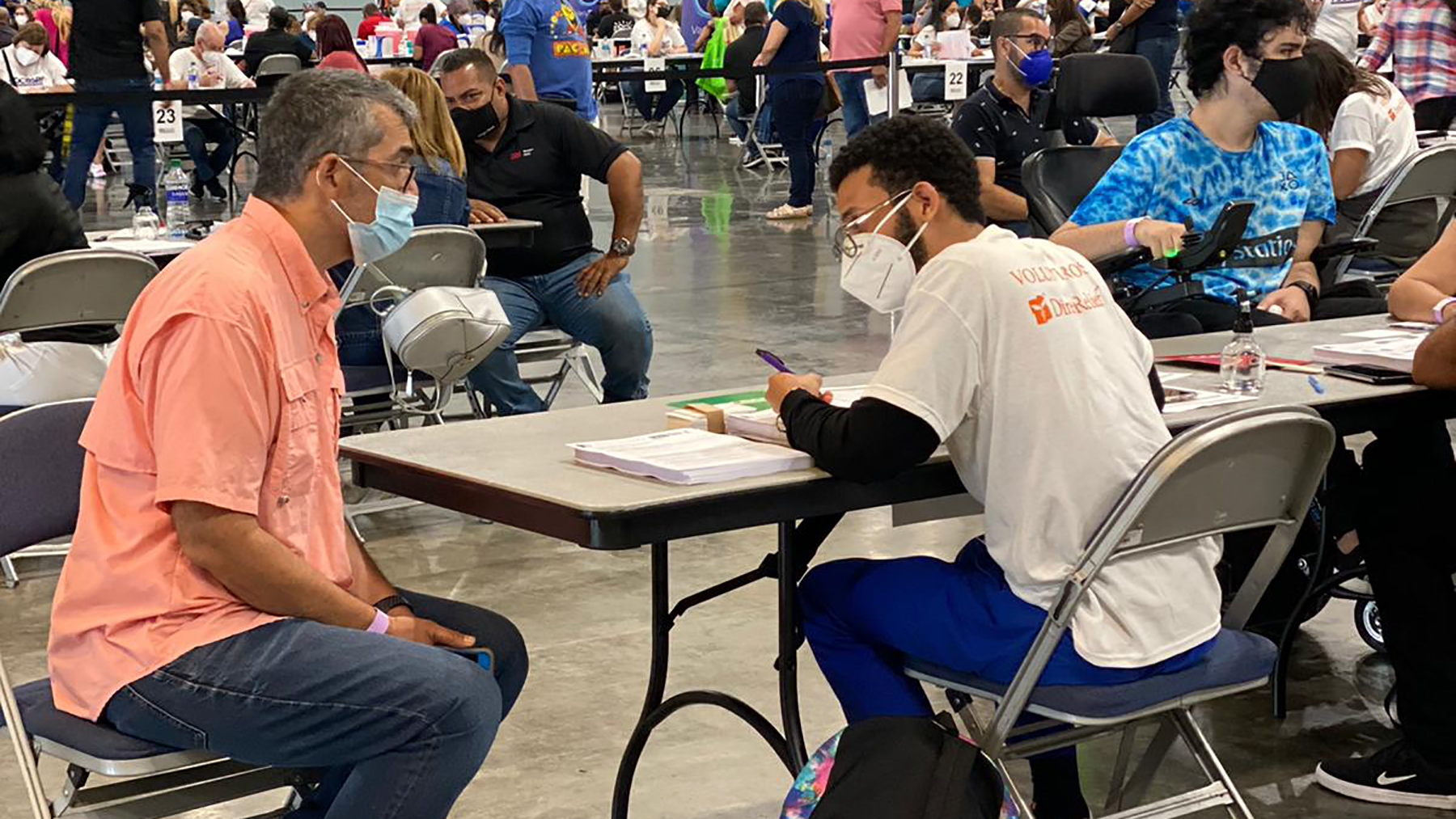 Thousands of people were vaccinated against Covid-19 at the San Juan Convention Center in Puerto Rico on Wednesday, March 31, 2021. The initiative was a joint effort between Direct Relief and the nonprofit VOCES, which coordinates vaccination efforts across the island. Direct Relief has been supporting vaccination efforts with grant funding as well as medical needs, like PPE and protective gear for health staff, in addition to boosting refrigeration capacity across the island for vaccine storage. (Ivonne Rodriguez/Direct Relief)