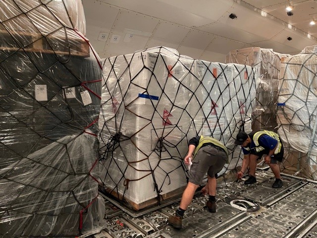 Shipments of PPE and Covid-19 aid are loaded onto charter aircraft in Chicago on May 25, 2021, bound for health facilities in Nepal. Recipients of these shipments include One Heart Worldwide and Dhulikhel Hospital. This is in response to Nepal’s recent surge in cases. (Photo courtesy of Silk Way West Airlines)