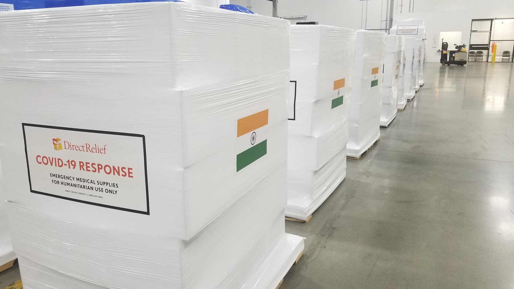 Shipments are staged at Direct Relief headquarters on May 15, 2021, bound for health facilities in Mumbai, India. (Thomas Tighe/Direct Relief)