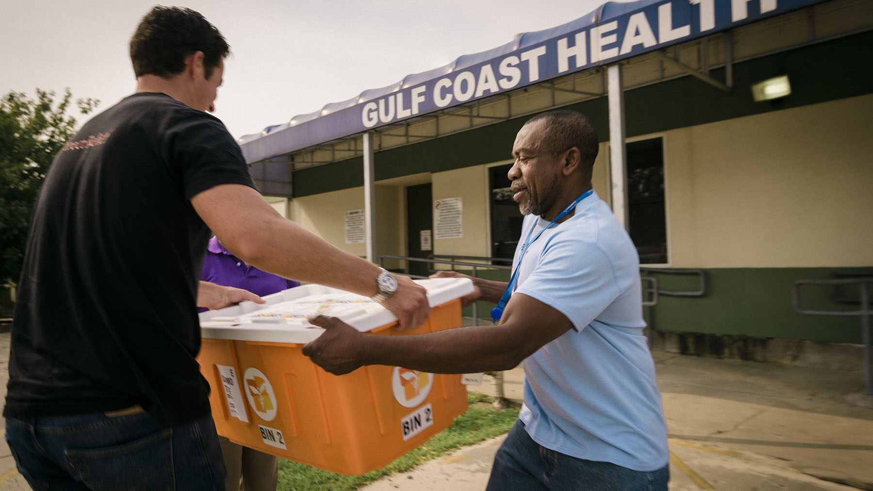 A Direct Relief staff member passes off emergency medical aid, including chronic disease medication, to a health center impacted by Hurricane Harvey in 2017. (Bimarian Films/Direct Relief)