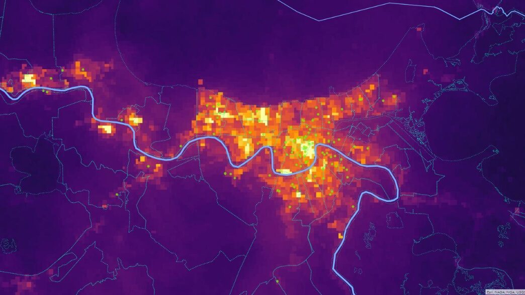 Baseline luminosity in and near New Orleans on August 25, 2021 with health center sites as circle points. Many portions of the map have gone dark since Ida swept through, and Direct Relief is working to provide health centers and free clinics with medical support and backup power options to continue patient care. (NASA Image/ Direct Relief analysis)