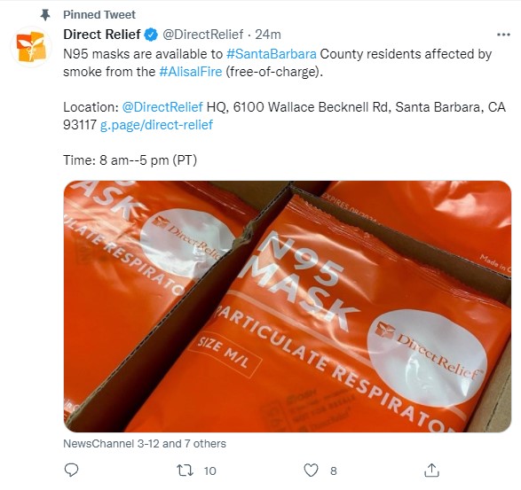 Direct Relief, which has headquarters in Santa Barbara and operates a 155,000-square-foot medical distribution facility, has been in daily communication with local agencies responding to the fire and its impacts, including the Santa Barbara County Office of Emergency Management, Santa Barbara County Emergency Operations Center, and the American Red Cross of the Central Coast to offer support for those impacted by the Alisal Fire.