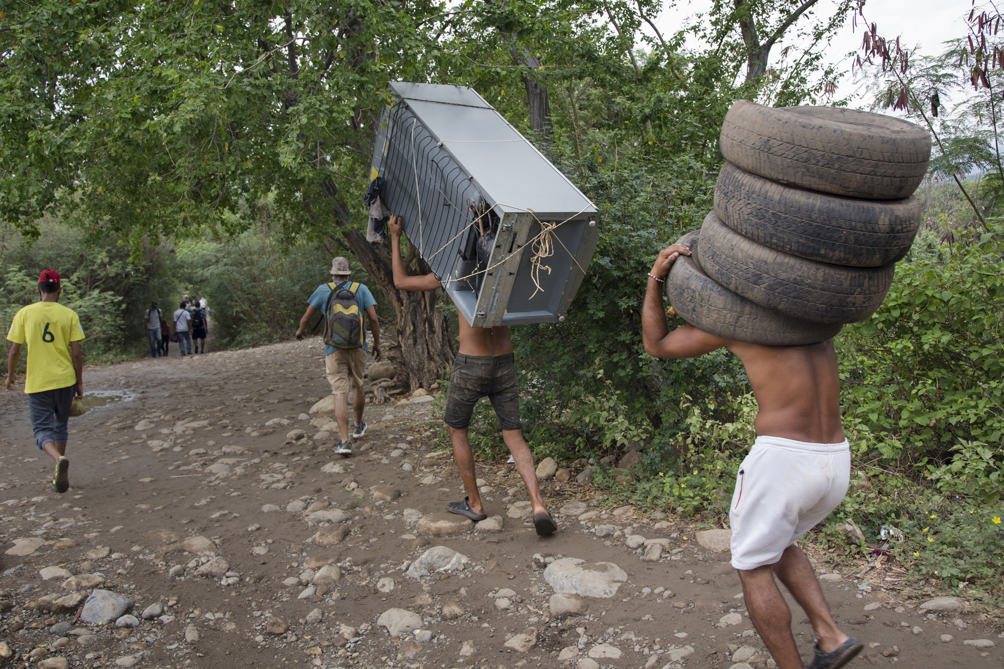 Migrants and daily workers carry goods along a path connecting Venezuela and Colombia, close to Villa del Rosario area in Norte de Santander Department in Colombia. This is one of the busiest spots for crossing between the two countries as the Simon Bolivar Bridge, the main connecting point in the area, has been closed for a long time.