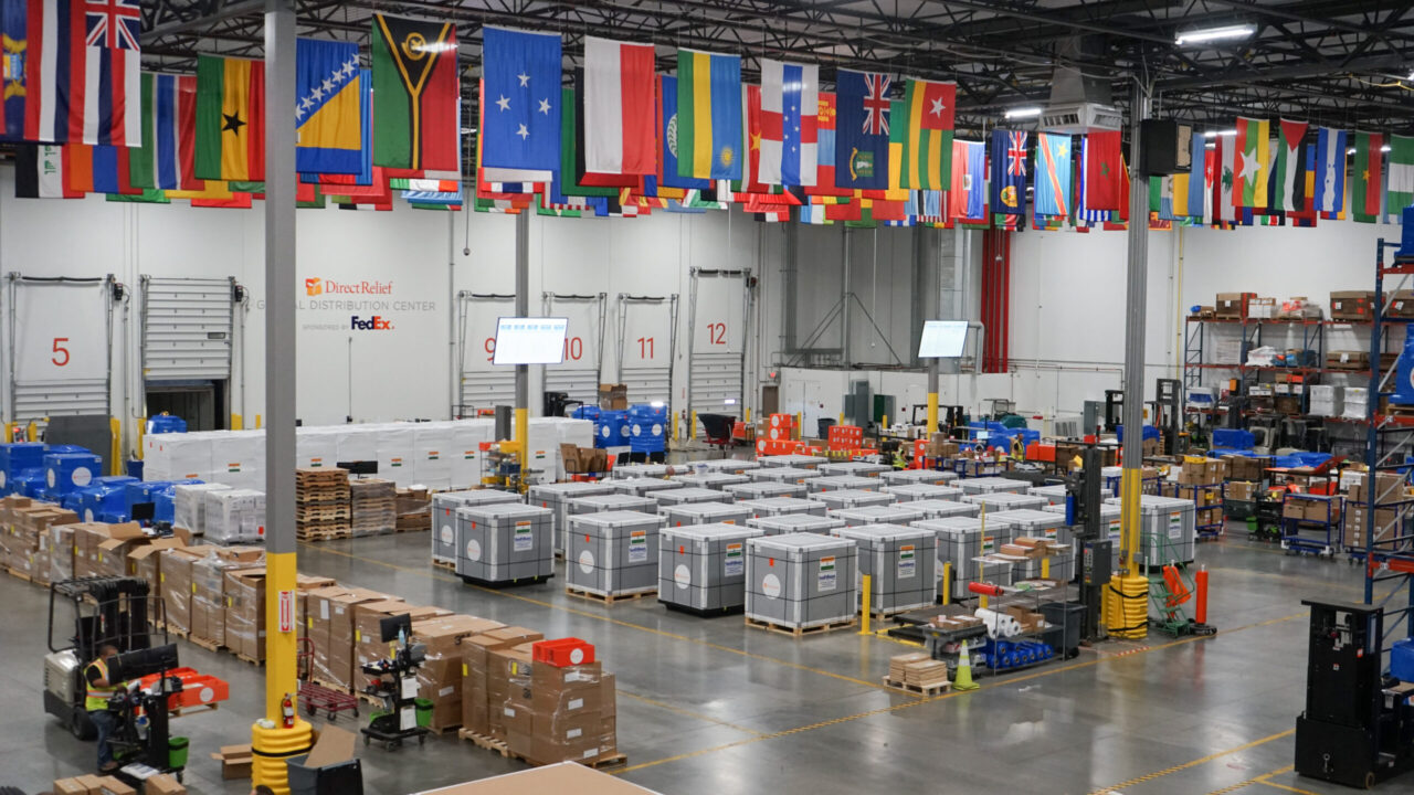 Covid-19 shipments are staged at Direct Relief’s global distribution hub. (Lara Cooper/Direct Relief).