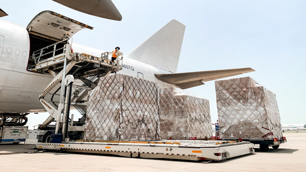Surgical face masks bound for Uganda and Mali are loaded onto aircraft in Shenzhen, China, on Sept. 6, 2020. The COVID-19 Action Fund for Africa has provided infusions of PPE since the beginning of the pandemic and continues to do so. (Direct Relief photo)