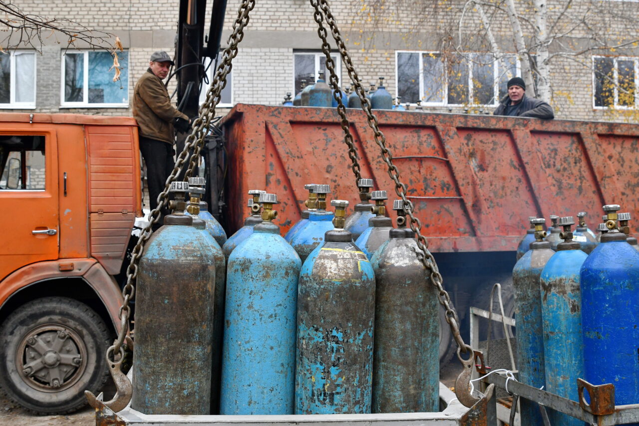 KRAMATORSK, DONETSK, UKRAINE – 2021/11/06: Workers load empty oxygen cylinders for servicing at Kramatorsk city hospital. Ukraine’s government at the start of November allocated extra finances of $15 million to the purchase of oxygen stations for hospitals in the region due to the surge in Covid-19 cases and the shortage of oxygen cylinders. (Photo by Andriy Andriyenko/SOPA Images/LightRocket via Getty Images)